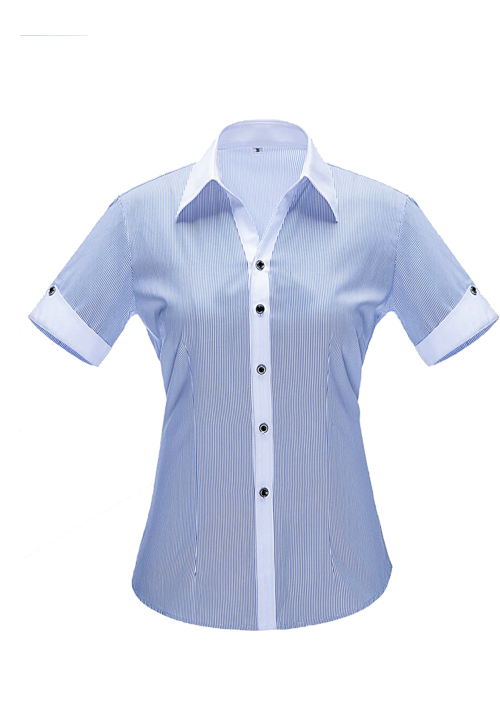 • 產品簡介:品名:女短袖v領襯衣;版型:修身版;貨號:YWD3501 ;面料:Y3501;顏色:藍色細條紋 ;Fabric:C35/T65
